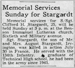 Clifford Harold Stargardt, son of August Franz and Mary (Rohwer) Stargardt, was born March 4, 1919 in Omaha, Nebraska. He registered for the draft October 16, 1940. At the time he was working at the Ideal Cememnt Stone Company in Omaha. A member of the Nebraska National Guard, he was mobilized to Federal Service in December 1940, and served as a Platoon Sergeant in the Third Platoon, Company K, 134th Infantry Regiment. S/Sgt Clifford H Stargardt was killed in action July 30, 1944, west of Torigni sur Vire, France. He is buried at Normandy American Cemetery, Colleville-sur-Mer, France.