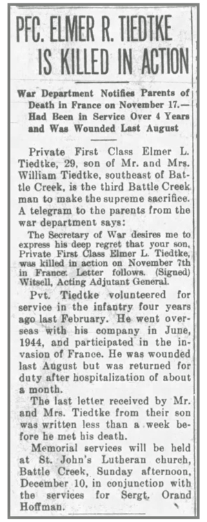 Elmer Leo Tiedtke, son of William Fred and Emelia "Emma" (Pleksnies) Tiedtke, was born March 5, 1916 in Madison County, Nebraska. He was an Automatic Rifleman in the Third Platoon, Company L, 134th Infantry Regiment. He was wounded in action July 18, 1944 during the battle for St Lo, France and returned to duty October 7, 1944. Pfc Elmer L Tiedtke was killed in action November 17, 1944 in the vicinity of Morhange, France. He is buried at Lorraine American Cemetery, Saint-Avold, France.