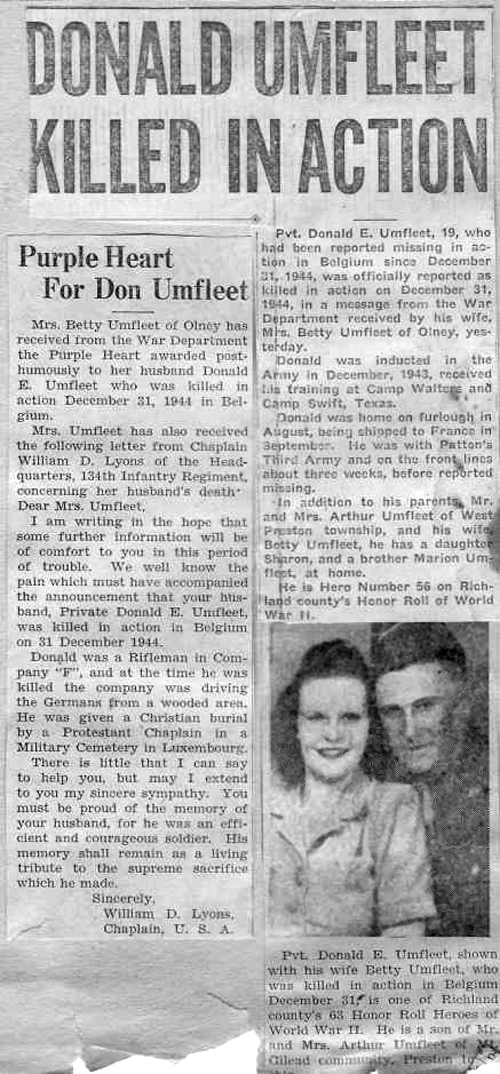 Donald Eugene Umfleet, son of Arthur and Edna (Campbell) Umfleet, was born September 22, 1925 in Dundas, Illinois. He married Betty Cralle and the couple had a daughter, Sharon. He registered for the draft September 22, 1943. At that time he was working for Richland County Shipping Association, Farm Bureau Office, in Olney, Illiois. He was inducted into the Army December 1943 and joined Company F, 134th Infantry Regiment from the 26th Infantry Division December 16, 1944 and served as a Rifleman. Pvt Donald E Umfleet was killed by small arms fire on December 31, 1944 while attacking to clear the woods south of Lutrebois, Belgium. He is buried at Luxembourg American Cemetery, Hamm, Luxembourg.