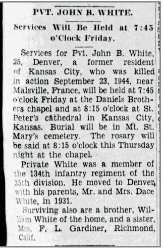 John Bernard White, son of Dace William and Mary Frances (Fogarty) White, was born December 11, 1918 in Kansas City, Kansas. His family moved to Denver, Colorado in 1931. He registered for the draft October 16, 1940. At the time he was living in Denver and working for the Denver Cab Company. He was inducted into the Army August 20, 1943 at Denver, Colorado. He joined Headquarters Company 2nd Battalion, 134th Infantry Regiment on September 15, 1944 from the 38th Replacement Battalion and served as an Anti-Tank Gun Crewman. He was killed in action by an enemy sniper September 23, 1944 while crossing a road 1 mile north of Malzeville, just north of Nancy, France. Pvt John B White is buried at Mount Saint Mary Catholic Cemetery, Kansas City, Missouri.
