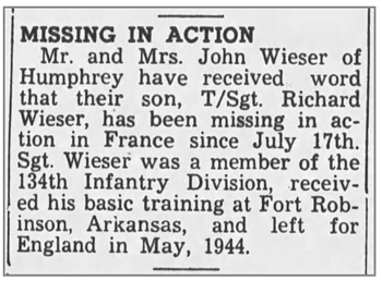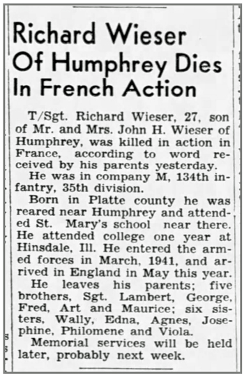 Richard Henry Wieser, son of John Henry and Elizabeth (Ruhkamp) Wieser, was born February 5, 1917 in Humphrey, Nebraska. He entered military service March 1941. He departed for the ETO in May 1944 and was billeted in Cornwall, England before landing on Omaha Beach July 6, 1944. T/Sgt Richard H Wieser was a Platoon Sergeant in the Second Platoon, Company M, 134th Infantry Regiment. He was reported missing during the battle at St Lo, France but it was later confirmed that he had been killed in action July 17, 1944. He is buried at Normandy American Cemetery, Colleville-sur-Mer, France.