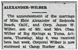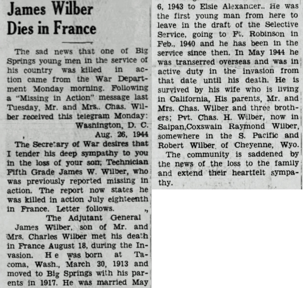 James Wilmot Wilber, son of Charles Griffin and Grace Arlene (Zimmerly) Wilber, was born March 30, 1913 in Tacoma, Washington. His family moved from Washington to Nebraska in 1917. He registered for the draft on October 16, 1940 and married Elsie Alexander on May 6, 1943. He was inducted into the Army in 1941 and served as a Surgical Technician in the Medical Detachment, 134th Infantry Regiment. T/5 James W Wilber was killed in action July 18, 1944 in the vicinity of St Lo, France. He was awarded the Silver Star Medal for gallantry during the battle in which he lost his life. He is buried at Normandy American Cemetery, Colleville-sur-Mer, France.