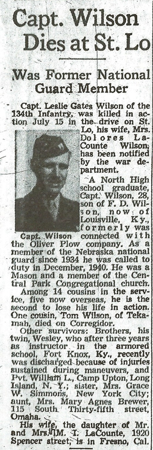 Leslie Gates Wilson, son of Francis Dow and Mabel Estelle (Gates) Wilson, was borni n Nebraska October 24, 1915. He was married to Delores LaCounte. He joined the Nebraska National Guard in 1934 and was inducted into Federal service December 23, 1940 at Omaha, Nebraska. Capt Leslie G Wilson was Commander of Headquarters Company 1st Battalion, 134th Infantry Regiment. He was killed in action July 15, 1944 during the battle for St Lo, France and is buried at Normandy American Cemetery, Colleville-sur-Mer, France.