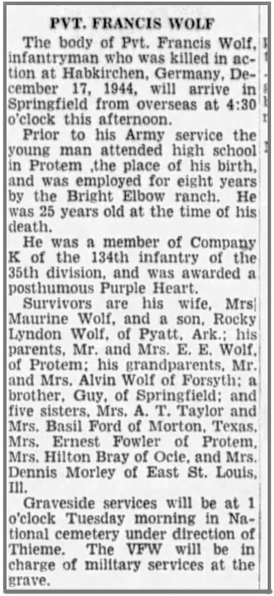 He was inducted into the Army May 19, 1944 at Jefferson Barracks, Missouri, joined Company K, 134th Infantry Regiment November 18, 1944 and served as a Rifleman. Pvt Francis M Wolf was killed in action while fighting off an enemy counter attack in the vicinity of Habirchen, Germany when he was struck and killed by fragments from artillery fire. He is buried at Springfield National Cemetery, Springfield, Missouri.