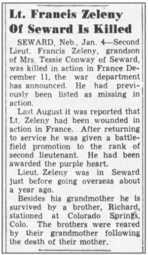 Francis Cleo Zeleny, son of Bohumil Theophil and Mildred Josephine (Conway) Zeleny, was born in Nebraska on February 20, 1920. 2nd Lt Zeleny joined Company M, 134th Infantry Regiment from the 86th Replacement Depot as a Platoon Leader on July 22, 1944. He was wounded in action August 2 in the vicinity of Torigni Sur Vire, France and returned to duty October 2, 1944. He was promoted to 1st Lieutenant October 17 and was again wounded in action November 14, 1944 but he remained on duty. 1st Lt Francis C Zeleny was killed in action December 11, 1944 in the vicinity of Sarreinsming, France. He is buried at Seward Cemetery, Seward, Nebraska.