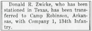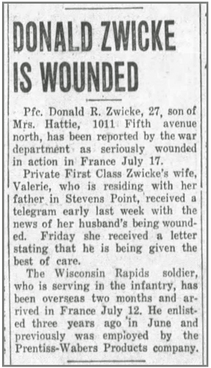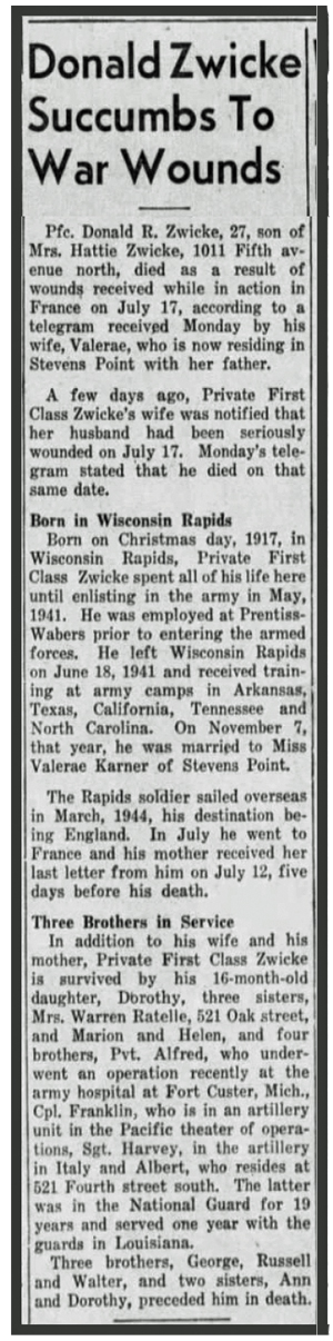 Pfc Donald R Zwicke served as an Automatic Rifleman in the Third Platoon, Company I, 134th Infantry Regiment. He landed on Omaha Beach July 6, 1944. He was seriously wounded by shrapnel on July 17, 1944 in the vicinity of St Lo, France and died of his wounds that same day. He is buried at Normandy American Cemetery, Coleville-sur-Mer, Normandy, France.
