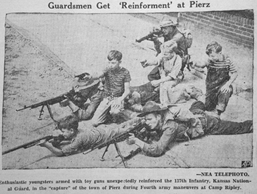 Camp Ripley hosted the Fourth Army sham warfare exhibition, which took place from August 12 through August 16, 1940. Over 45,000 troops from Minnesota, Nebraska, Missouri, Kansas and Arkansas were split into Red and Blue armies and "war" was declared at midnight on August 12, 1940. Ground, air, tank and cavalry troops were involved in the maneuvers, which took place over 45 miles of territory between Onamia/Mille Lacs Lake and Morrison County. The goal was to see which army would take Camp Ripley first. The Red Army was victorious, with the "war" officially concluding at 11:27 a.m. on August 16, 1940.