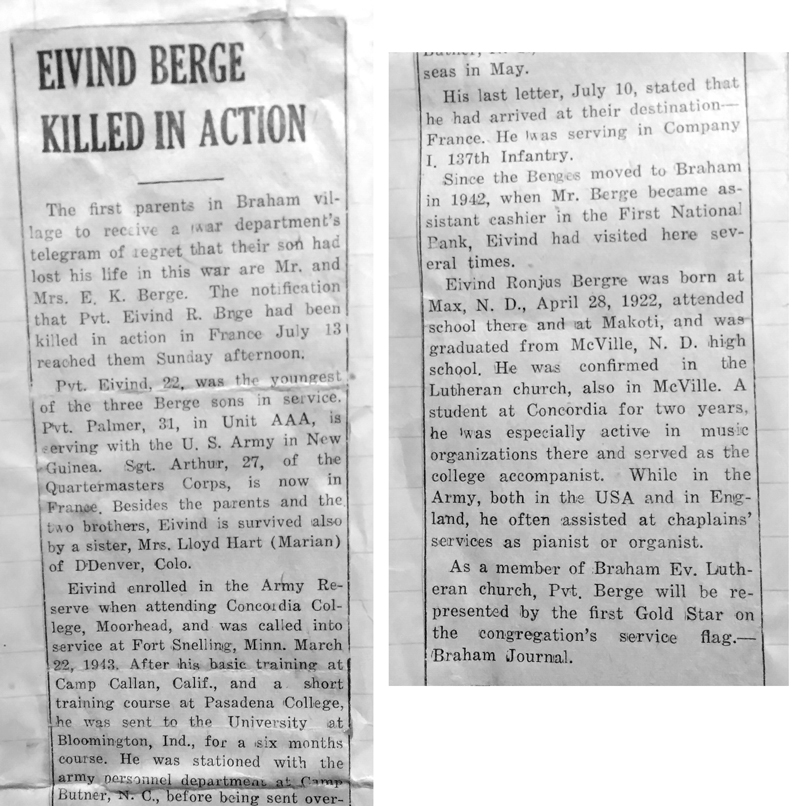 Eivind Rinjus Berge, son of Eivind Knudsen and Annie Marie (Bunde) Berge, was born April 28, 1922 in Max, North Dakota. He moved to Minnesota sometime between 1935 and 1940 and registered for the draft June 30, 1942. At that time he was living in Braham and working at American State Bank in Moorehead, Minnesota. He entered the service March 22, 1943 at Fort Snelling, Minnesota and served as a Rifleman in Company I, 137th Infantry Regiment. Pvt Eivind R Berge was killed in action by artillery shell fragments on July 13, 1944 during the battle for St Lo, France. He is buried at Normandy American Cemetery, Colleville-sur-Mer, France.