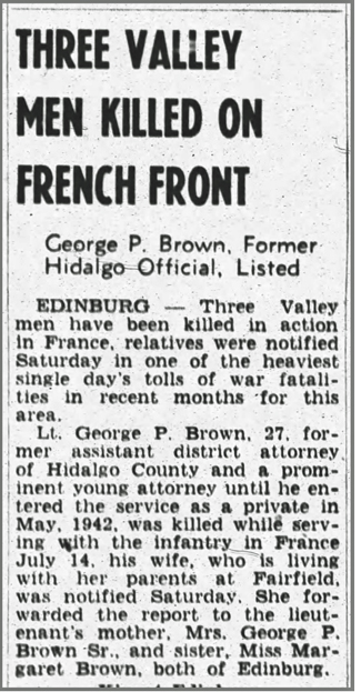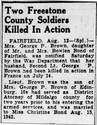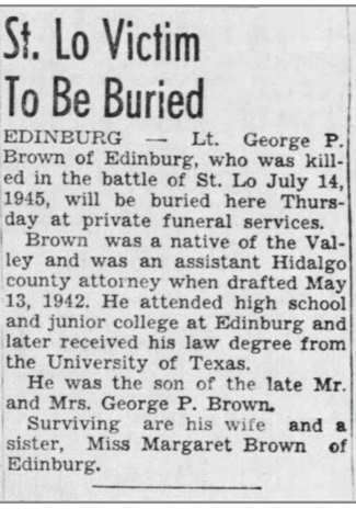 George Pierce Brown, the son of George and Nora Brown, was born November 22, 1916 in Mission, Texas. He attended high school and junior college in Edinburg, Texas and received a law degree from the University of Texas. He registered for the draft at Hidalgo, Texas on October 16, 1940. According to his draft registration he was 23 years old, 5' 11 1/2" tall, weighed 144 pounds, with brown eyes, brown hair and a light complexion. He was drafted on May 13, 1942 and married Christine Bond on August 15, 1942. Prior to his military service he was an Assistant Hidalgo County Attorney.