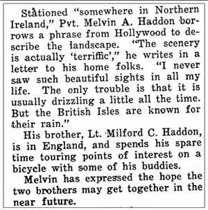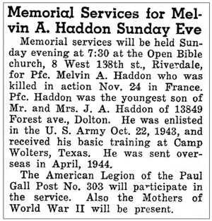 Melvin Alexander Haddon, son of John Hamilton and Mary Alice (Wilkinson) Haddon, was born July 12, 1925 in Dolton, Illinois. He registered for the draft July 12, 1943. At the time he was working at Acme Steel Company in Riverdale, Illinois. He enlisted in the Army October 22, 1943 and arrived in the ETO in April 1944. He joined Headquarters Company 3rd Battalion, 137th Infantry Regiment as a Field Lineman from the 86th Replacement Battalion July 17, 1944 when the unit was in the vicinity of La Meauffe, France, about 5 miles north of St Lo, and was awarded the Combat Infantryman Badge August 1, 1944. He was wounded in action October 10 by shell fragments in the vicinity of Fossieux, France, returned to duty, and was awarded a Purple Heart. He was promoted to Private First Class October 17, 1944. Pfc Melvin A Haddon was killed in action November 24, 1944 in the vicinity of Diffembach, France. He is buried at Memorial Park Cemetery, Winchester, Tennessee.