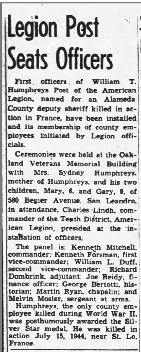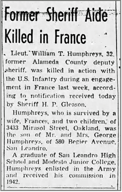 William Thomas Humphreys, son of George Nathaniel and Sydney (Sherer) Humphreys, was born in Oakland, California on December 16, 1912. An Alemeda County deputy sheriff in civilian life, he and his wife Frances had 2 children, Mary and Gary. He registered for the draft on October 16, 1940. His draft registration lists him as 6' 2" tall, weighing 198 pounds, with brown hair and brown eyes. 1st Lt William T Humphreys was Killed in Action July 15, 1944 near St Lo, France and is buried at the Normandy American Cemetery, Colleville-sur-Mer, France.