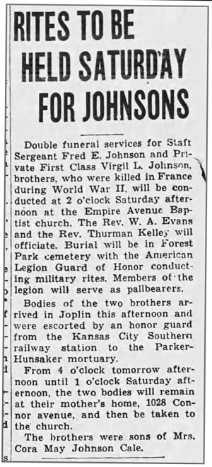 Fred Everett Johnson, son of Wyatt Isaac and Cora May (Conrow) Johnson, was born February 12, 1920 in Picher, Oklahoma. He was inducted into the Army February 3, 1941. He joined Company I, 137th Infantry Regiment as a Squad Leader from the 48th Replacement Battalion August 11, 1944 while the unit was near Mortain, France and was promoted to Staff Sergeant September 1, 1944. S/Sgt Fred E Johnson was killed in action September 23, 1944 in the vicinity of the Champenoux Forest east of Nancy, France. He is buried at Forest Park Cemetery, Joplin Missouri.