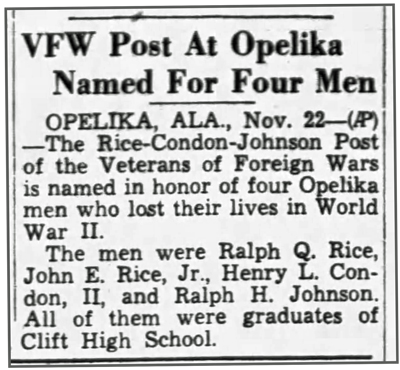 Ralph Heaton Johnson, son of Heaton Whitfield and Annie (Cole) Johnson was born December 31, 1919. He lived in Opelika, Alabama and attended Clift High School there. He served in Company I, 137th Infantry Regiment and was Killed in Action during the battle for St Lo, France on July 14, 1944. 1st Lt Ralph H Johnson is buried at Shiloh Baptist Church Cemetery, Randolph County, Alabama.