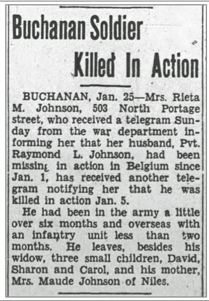 Raymond Lawrence Johnson, son of Richard Lester and Maude (Truelove) Johnson, was born on June 2, 1921, in Indiana. He married Rieta May Brewer on November 4, 1939, and together they had three children: David Lester, Carol Ann, and Sharon Lee. He registered for the draft on February 15, 1942, at the age of 20, while living in Niles, Michigan, and working at the Kawneer Company, a manufacturing plant in Niles. He was inducted into the U.S. Army on June 23, 1944. After training at Camp Blanding, Florida, he was deployed to the European Theater of Operations (ETO) in November 1944. On December 21, 1944, he joined Company K, 137th Infantry Regiment as a rifleman from the 14th Replacement Battalion, while the unit was near Sarreguemines, France. For his service, he was awarded the Combat Infantryman Badge on January 1, 1945. Pvt Raymond L Johnson was initially reported missing and was later confirmed to have been killed in action on January 5, 1945, near Villers-la-Bonne-Eau, approximately six miles south of Bastogne, Belgium. He is buried at Luxembourg American Cemetery in Hamm, Luxembourg.