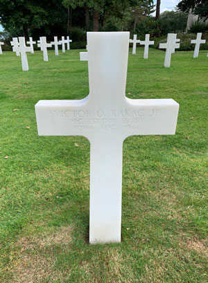 Victor Otto Kakac, Jr, son of Victor Otto, Sr and Blanche (Frazier) Kakac, was born August 31, 1925 in Cresco, Iowa. He registered for the draft December 11,1942 and was inducted into the Army March 22, 1943. After induction he served in Company C, 309th Infantry Regiment at Camp Butner, North Carolina and departed for the ETO May 7, 1944. He joined Company M, 137th Infantry Regiment as a Light Mortar Crewman from the 86th Replacement Battalion on July 17, 1944 when the unit was in the vicinity of St Lo, France. Pfc Victor O Kakac, Jr was killed in action August 1, 1944 in the vicinity of Torigini Sur Vire, France. He is buried at Normandy American Cemetery, Colleville-sur-Mer, France.