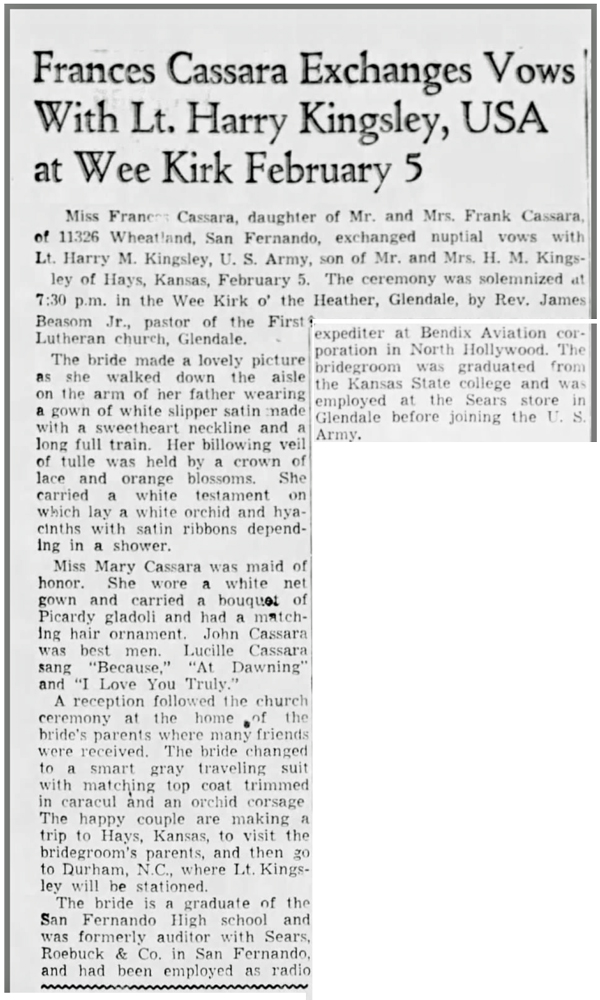 Harry Melvin Kingsley, son of Harrison Melvin and Myrtle Mae (Palmer) Kingsley, was born September 4, 1918 in Hays, Kansas. He attended Kansas State University in Manhattan, Kansas where he studied agriculture. He moved to California around 1939 or 1940 and registered for the draft in Los Angeles on October 16, 1940. His draft record lists him as 6' 2" tall, weighing 180 pounds, with brown hair and brown eyes. He was inducted into the Army at Los Angeles, California October 24, 1942. He married Frances Cassara in Glendale, California on February 5, 1944.