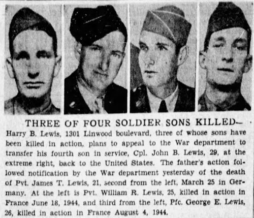 George Edward Lewis, son of Harry Burton and Anna Ethel (Elkins) Lewis, was born May 20, 1918 n St Clair County, Missouri. He registered for the draft October 16, 1940, served as a Rifleman in Company K, 137th Infantry Regiment, and landed at Omaha Beach in Normandy France July 7, 1944. He was awarded the Combat Infantryman Badge August 1, 1944. Pfc George E Lewis was reported missing and was later confirmed killed in action August 4, 1944 in the vicinity of the Vire River south of St Lo, France. He is buried at Iconium Cemetery, Iconium, Missouri.
