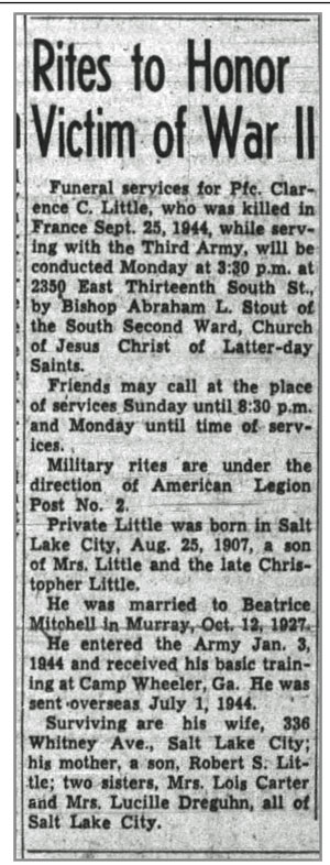 Clarence Christopher Little, son of Christopher and Mary (Littley) Little, was born August 25, 1907. He married Beatrice Mitchell October 12, 1927 and the couple had a son, Robert. He was inducted into the Army January 3, 1944 at Fort Douglas, Utah and attended basic training at Camp Wheeler, Georgia before departing for the ETO in July 1944. He joined Company L, 137th Infantry Regiment as a Rifleman from the 48th Replacement Battalion August 11, 1944 when the unit was in the vicinity of Mortain, France. Pfc Clarence C Little was killed in action September 25, 1944 in the vicinity of Gremecey, France. He is buried at Larkin Sunset Lawn Cemetery, Salt Lake City, Utah.