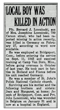 Bernard J Lonczinski, son of Walter Edward and Josephine (Czarniecki) Lonczinski, was born December 25, 1919 in Hazleton, Pennsylvania. He was inducted into the Army September 11, 1943 at Wilkes-Barre, Pennsylvania. He arrived in the ETO November 1, 1944 and joined Company F, 137th Infantry Regiment December 25, 1944 as a Scout when the unit was in the vicinity of Metz, France and was awarded the Combat Infantryman Badge January 1, 1945. Pfc Bernard J Lonczinski was initially reported missing February 27, 1945 in the vicinity of Gerderath, Germany and was later confirmed killed in action on that date. He is buried at Saint John the Baptist Polish National Church Cemetery, Hazleton, Pennsylvania.