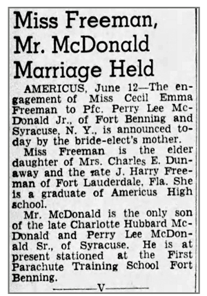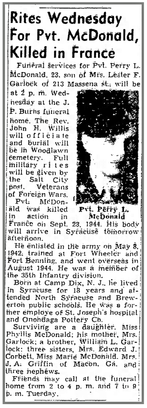 Perry Lee McDonald, Jr, son of Perry Lee, Sr and Charlotte Marion (Hubbard) McDonald, was born May 15, 1921 at Fort Dix, New Jersey. He married Cecil Emma Freeman in July 1943 and the couple had a daughter, Phyllis Kathleen. He registered for the draft February 15, 1942 while living in Syracuse, New York and working for the Onondaga Pottery Company. He was inducted into the Army May 5, 1942 at Syracuse, New York and joined Company I, 137th Infantry Regiment as a Rifleman from the 38th Replacement Battalion September 16, 1944. Pvt Perry L McDonald, Jr was killed in action by shrapnel from a shell blast September 23, 1944 in the vicinity of Champenoux, France. He is buried at Woodlawn Cemetery Syracuse, New York.