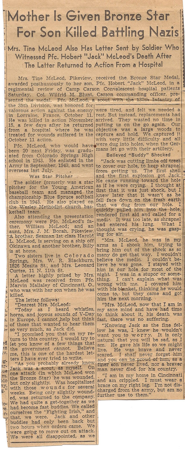 Hobert "Jack" McLeod, son of William Silver and Tina (Tune) McLeod, was born June 22, 1925 in Harlan County, Kentucky. He moved with his family to Colorado sometime between 1928 and 1930. He registered for the draft on his 18th birthday, June 22, 1943, when he was living in Pikeview, Colorado, and working at the Coca Cola Bottling Company in Colorado, Springs. He was inducted into the Army August 7, 1943 at Denver, Colorado and joined Company L, 137th Infantry Regiment as a Rifleman from the 38th Replacement Battalion August 28, 1944 when the unit was about 30 miles east of Orleans, France. He was promoted to Private First Class and awarded the Combat Infantryman Badge October 1, 1944. He was wounded by shrapnel October 11, 1944 in the vicinity of Fossieux, France and returned to duty November 13, 1944. Pfc Hobert McLeod was killed in action by an artillery blast November 15, 1944 in the vicinity of Etang de Mutche, north of Morhange, France. He is buried at Evergreen Cemetery, Colorado Springs, Colorado.