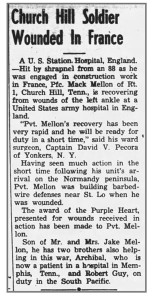 Mack Reeser Mellon, son of Jake Andrew and Katherine (Vaughn) Mellon, was born July 14, 1917 in Scott County, Virginia. The family moved to Tennessee sometime between 1920 and 1923. He registered for the draft October 16, 1940 when he was living in Church Hill Tennessee and was inducted into the Army February 6, 1942 at Fort Oglethorpe, Georgia. He was stationed at Camp Forrest Tennessee, Fort Brady Michigan, and Camp Butner North Carolina before departing for the ETO May 11 and arriving in England May 24, 1944 where he was billeted in Cornwall until crossing the English Channel and landing at Omaha Beach in Normandy, France July 7, 1944. He was a Rifleman in Company K, 137th Infantry Regiment and was wounded by shrapnel July 21, 1944 during the battle for St Lo, France. He was awarded the Combat Infantryman Badge August 2 and returned to duty November 21, 1944.