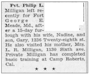 Philip Lueroy Milligan, son of Lue Roy and Rose Anne (Lannan) Milligan, was born February 3, 1912 in Hiteman, Iowa. He married Nadine Virginia Bridges June 3, 1939 and the couple had a son, Gary Lou. He registered for the draft October 16, 1940. At the time he was living in Des Moines, Iowa and was inducted into the Army March 20, 1944 at Camp Dodge Herrold, Iowa. He joined Company E, 137th Infantry Regiment as a Rifleman from the 71st Replacement Battalion October 3, 1944 while the unit was in the vicinity of Grémecey, France. He was awarded the Combat Infantryman Badge November 1 and was promoted to Private First Class November 20, 1944. Pfc Philip L Milligan was seriously wounded in action by shell fragments February 27 in the vicinity of Gladbach, Germany, transferred to the 105th Evacuation Hospital, and died of his wounds the following day, February 28, 1945. He is buried at Netherlands American Cemetery, Margraten, Netherlands.
