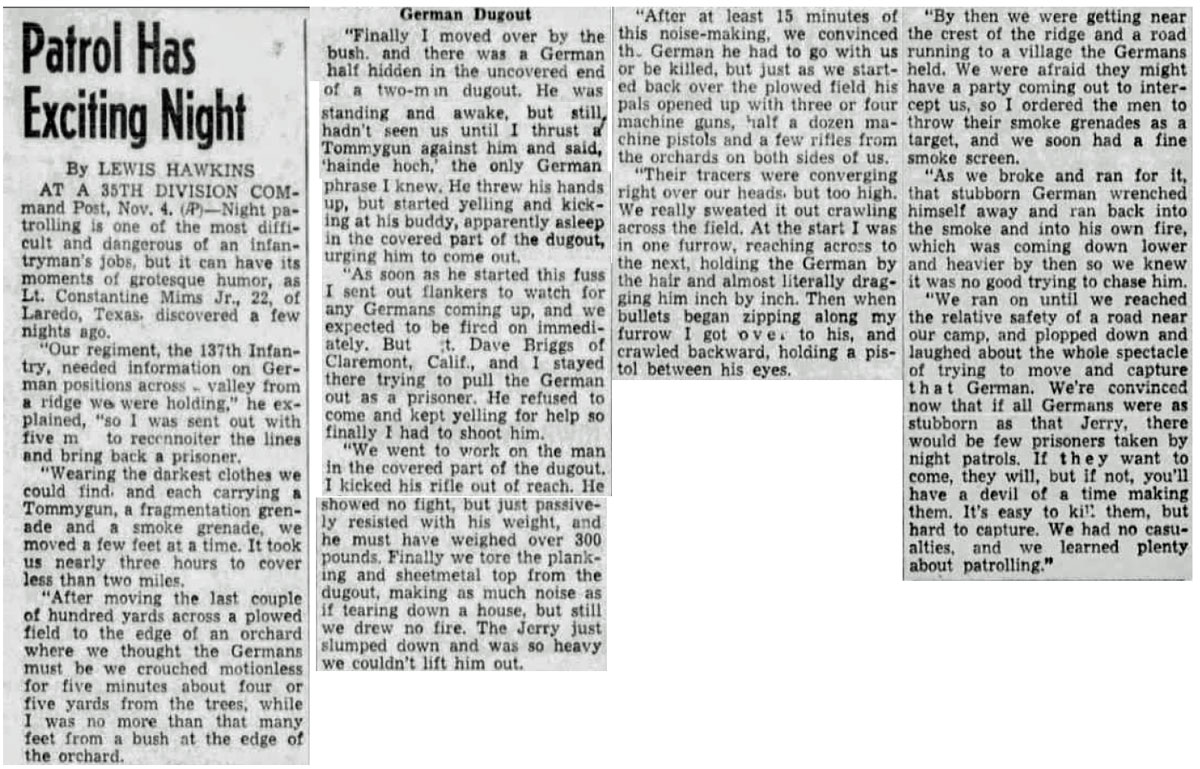 First Lieutenant Constantine Mims Jr, O1312198, Infantry, United States Army, for gallantry in action in the vicinity of * * * , France on 2 November 1944. Lieutenant Mims led a patrol of five men into enemy territory at dusk on 2 November with the mission of probing enemy defenses. He skillfully directed the movement of his patrol through a mine field and several barbed wire entanglements, then deployed the troops near their objective. He moved forward alone to reconnoiter, encountered a German soldier and rendered him unconscious, then engaged a second German in hand-to-hand combat and took him prisoner. The first German regained consciousness and was killed by Lieutenant Mims in the ensuing fight. The noise of the struggle had alerted enemy positions in the area and Lieutenant Mims led his patrol back to the American lines through a concentration of machine gun fire. By his aggressive leadership and initiative, Lieutenant Mims secured information which contributed to the success of an attack launched in this area several days later. Entered military service from Texas. General Orders No. 56, Headquarters 35th Infantry Division, 12 December 1944 |