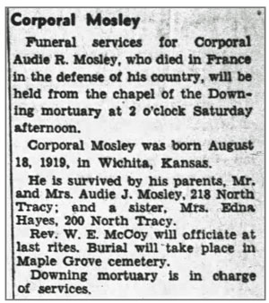 Audie Richard Mosley, son of Audie James and Ethel (Iseminger) Mosley, was born August 18, 1919 in Wichita, Kansas. He registered for the draft October 16, 1940, served in Cannon Company, 137th Infantry Regiment, and landed at Omaha Beach, Normandy France July 9, 1944. Cpl Audie R Mosley was killed in action July 11, 1944 in the vicinity of La Meauffe just north of St Lo, France and was posthumously awarded the Combat Infantryman Badge August 2, 1944. He is buried at Maple Grove Cemetery, Wichita, Kansas.