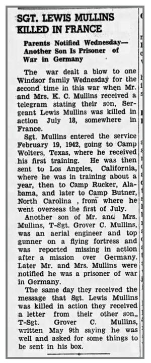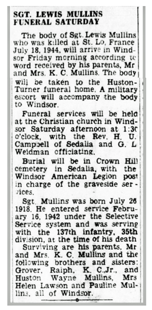 J W Lewis Mullins, son of Knova Chapman and Nellie Mae (Witcher) Mullins, was born July 26, 1918 in Saline County, Missouri. He registered for the draft October 16, 1940. At the time he was a farmer living in Windsor, Missouri. He was inducted into the Army February 16, 1942, served as a Squad Leader in Company D, 137th Infantry Regiment, and landed at Omaha Beach Normandy France July 7, 1944. Sgt J W Lewis Mullins was killed in action July 18, 1944 in the vicinity of St Lo, France and was posthumously awarded the Combat Infantryman Badge August 2, 1944. He is buried at Crown Hill Cemetery, Sedalia, Missouri.
