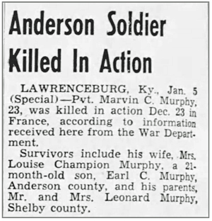 Marvin Clay Murphy, son of Leonard Clay and Bessie Jane (Whitehouse) Murphy, was born March 30, 1921 in Shelby County, Kentucky. He married Louise Frances Champion and the couple had a son, Earl. He registered for the draft February 16, 1942 and was inducted into the Army April 1, 1944 at Fort Thomas, Newport, Kentucky. He joined Company E, 137th Infantry Regiment from the 38th Replacement Battalion October 2, 1944 when the unit was in the vicinity of Gremecey, France and served as a Scout. He was promoted to Private First Class November 20 and awarded the Combat Infantryman Badge November 1, 1944. Pfc Marvin C Murphy was reported missing November 23, 1944 in the vicinity of Hilsprich, France and was confirmed killed by shell fragments December 8, 1944. He is buried at Lorraine American Cemetery, Saint Avold, France.