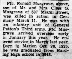 Ronald Dale Musgrave, son of Closs Gerald and Reba Mae (Neidig) Musgrave, was born October 26, 1925 in Marion, Ohio. He was inducted into the Army March 11, 1944 at Fort Thomas, Newport, Kentucky. He joined Company L, 137th Infantry Regiment December 8, 1944 as a Rifleman from the 17th Replacement Battalion while the unit was in the vicinity of Neufgrange, France. He was awarded the Combat Infantryman Badge February 1 and promoted to Private First Class February 3, 1945. Pfc Ronald D Musgrave was killed in action March 11, 1945 in the vicinity of Rheinberg, Germany. He is buried at Marion Cemetery, Marion, Ohio.