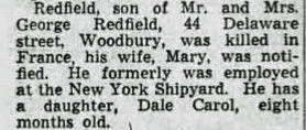 Searle Noble Redfield, son of George and Arabella (Caywood) Redfield, was born June 13, 1918 in Jersey City, New Jersey. He married Elizabeth Lyster on July 25, 1941 and the couple had one child, a daughter Dale Carol. He registered for the draft October 16, 1940, and was inducted into the Army August 12, 1943 at Camden, New Jersey. He joined Company A, 137th Infantry Regiment from the 86th Replacement Battalion July 20, 1944 and was awarded the Combat Infantryman Badge August 1, 1944. Pfc Searle N Redfield was killed in action in the vicinity of Lorey south of Nancy, France, just east of the Moselle River. He is buried at Eglington Cemetery, Clarksboro, New Jersey.