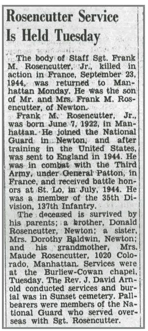 Frank Marion Rosencutter, Jr, son of Frank Marion and Lena Myrtle (Dugan) Rosencutter, was born June 7, 1922 in Manhattan, Kansas. He was a member of the National Guard, inducted into the Army December 23, 1940 at Newton, Kansas when the 137th Infantry Regiment was ordered into Federal service. He transferred from Headquarters Company 2nd Battalion to Company F on July 4 while enroute to Normandy, France and landed on Omaha Beach July 8, 1944. He was promoted to Sergeant July 21, made Squad Leader August 3, and was promoted to Staff Sergeant September 1, 1944. He was awarded the Combat Infantryman Badge August 1, 1944 and a Bronze Star Medal for heroism during the battle for St Lo, France. S/Sgt Frank M Rosencutter, Jr was seriously wounded in action September 22 and transferred to the 60th Field Hospital where he died of his wounds the following day, September 23, 1944. He is buried at Sunset Cemetery, Manhattan, Kansas.