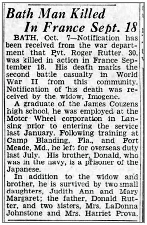 Roger Lee Rutter, son of Donald Alfred and Martha (Hall) Rutter, was born May 25, 1914 in Lansing, Michigan. He married Ann Imogene Watts October 30, 1937 and the couple had 2 daughters, Judy and Mary Margaret. He registered for the draft October 16, 1940. At the time he was living in Bath, Michigan and working at the Motor Wheel Corporation in Lansing. He entered the service in January 1944 and joined Company G, 137th Infantry Regiment from the 53rd Replacement Battalion on September 8, 1944 serving as a Light Machine Gunner. Pvt Roger L Rutter was killed in action by an artillery shell blast September 18, 1944 in the vicinity of Nancy, France. He is buried at Lorraine American Cemetery, Saint Avold, France.