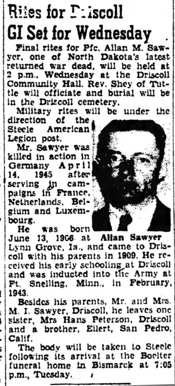 Allan Maynard Sawyer, son of Mathias and Josephine (Gunderson) Sawyer, was born June 13, 1906 in Lynn Grove, Iowa. He moved to Driscoll, North Dakota with his parents in 1909. He registered for the draft October 16, 1940 and was inducted into the Army in February 1943. He joined Company G, 137th Infantry Regiment on July 20, 1944 from the 86th Replacement Battalion and was awarded the Combat Infantryman Badge August 1, 1944. He transferred to Headquarters Company 137th Infantry Regiment December 1, 1944. Pfc Allan M Sawyer was originally reported missing and it was later confirmed that he had been killed in action about 50 miles north of Magdeburg, Germany west of the Elbe River. He is buried at Grace Lutheran Cemetery, Driscoll, North Dakota.