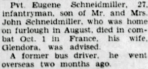 John Eugene Schneidmiller, son of John Conrad and Nettie (Hetzel) Schneidmiller, was born May 25, 1917 in East Liverpool, Ohio. He married Glendora Amelia Smith November 13, 1939 and the couple had 2 daughters, Judith and Janet Rose. He registered for the draft October 16, 1940. At the time he was working for John Keil Company in East Liverpool. He was inducted into the Army March 4, 1944 at Fort Benjamin Harrison, Indiana and joined Company I, 137th Infantry Regiment on September 23, 1944 from the 38th Replacement Battalion, serving as a Rifleman. Pvt John E Schneidmiller was killed in action October 1, 1944 by artillery shell shrapnel in the vicinity of the Gremecey Forest, France. He is buried at Lorraine American Cemetery, Saint-Avold, France.