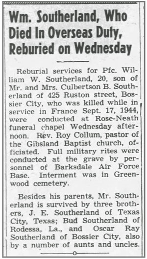 William Walter Southerland, son of Culbertson B and Emma Todd (Byrd) Southerland, was born November 28, 1924 in Oil City, Louisiana. He registered for the draft at age 18 on December 29, 1942. He was a student at the time. He was inducted into the Army August 9, 1943 and served in Company G, 137th Infantry Regiment. He was promoted to Private First Class July 1, was wounded in action July 13 in the vicinity of St Lo, France and returned to duty July 19, 1944. He was awarded the Combat Infantryman Badge August 2, 1944. Pfc William W Southerland was killed in action September 17, 1944 in the vicinity of Nancy, France. He is buried at Greenwood Cemetery, Shreveport, Louisiana.