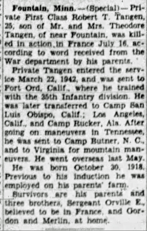 Robert Truman Tangen, son of Theodore Sigvald and Alma Melvina (Asleson) Tangen, was born in Minnesota on October 30, 1918. He was inducted into the Army on March 22, 1942 and served as a Messenger in Company E, 137th Infantry Regiment, 35th Infantry Division. He was killed in action on July 16, 1944 during the battle for St Lo, France. Pfc Robert T Tangen is buried at Normandy American Cemetery at Colleville-sur-Mer, France.