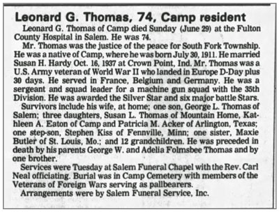 Leonard George Thomas, son of George and Adelia (Folmsbee) Thomas, was born July 30, 1911 in Camp, Arkansas. He was a Machine Gunner in Company M, 137th Infantry Regiment and landed at Omaha Beach, Normandy France July 7, 1944. He was awarded the Combat Infantryman Badge on August 1, 1944 and the Silver Star Medal for gallantry in action in the vicinity of Gremecey, France on September 27, 1944. He was transferred to B Battery, 127th Field Artillery Battalion January 24, 1945. After the war's end, he returned to the U.S. aboard the Queen Mary departing Southampton, England on September 5, 1945 and arriving in New York Harbor 5 days later on Monday, September 10, 1945. Sgt Leonard G Thomas passed away June 19, 1986. He is buried at Camp Cemetery, Camp AR.