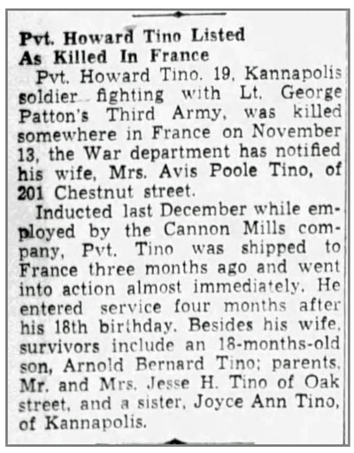 Howard Jessie Tino Jr, son of Jessie Howard and Beulah Mary (Heath) Tino, was born August 4, 1925 in Gastonia, North Carolina. He married Avis Katherine Poole and the couple had a son, Arnold Bernard Tino. He registered for the draft August 4, 1943. At the time he was living in Kannapolis, North Carolina and working at Cannon Textile Mill. He was inducted into the Army December 9, 1943 at Camp Croft, South Carolina and joined Company B, 137th Infantry Regiment from the 38th Replacement Battalion October 11, 1944 and served as a Rifleman. Pvt Howard J Tino, Jr was killed in action November 13, 1944 in the vicinity of Achain, France. He is buried at Carolina Memorial Park, Concord, North Carolina.