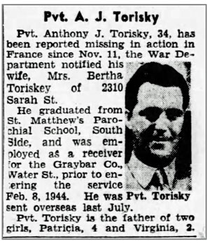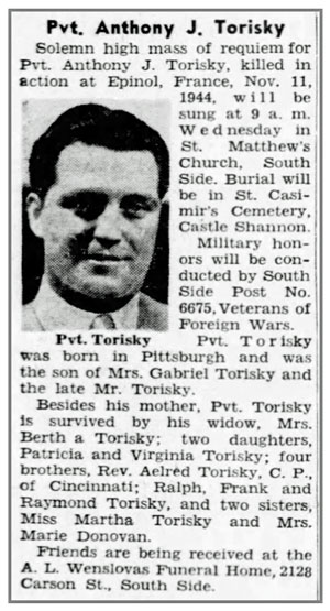 Anthony J Torisky, son of Gabriel Joseph and Susanna Torisky, was born March 14, 1910 in Pittsburgh, Pennsylvania. He married his wife Bertha June 23, 1936 and the couple had 2 daughters, Patricia and Virginia. He entered active service February 8, 1944 at Pittsburgh, joined Company C, 137th Infantry Regiment from the 53rd Replacement Battalion on September 7, 1944, and served as a Rifleman. Pvt Anthony J Torisky was reported missing November 11, 1944 north of Chateau Salins, France. It was later confirmed that he had been killed in action. He is buried at Saint Casimir Cemetery, Whitehall, Pennsylvania.