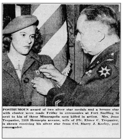 Elmer Clarence Trepanier, son of Wilburn B and Selma Josephine (Erickson) Trepanier, was born June 7, 1921 in Minnesota. He married June L Gage at Beltrami, Minnesota on November 8, 1941. He registered for the draft February 16, 1942 and entered the Army in September 1942. He served as a Light Mortar Crewman in Company B, 137th Infantry Regiment. Pfc Elmer C Trepanier was killed in action July 11, 1944 during the battle for St Lo, France and was awarded a Silver Star Medal for gallantry in action during the battle in which he died. He is buried at Fort Snelling National Cemetery, Minneapolis, Minnesota.