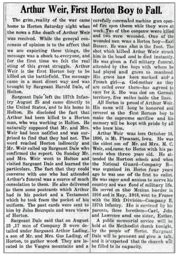 Arthur Norton Weir, son of Mahlon and Clara (Bond) Weir, was born October 16, 1896 in Mount Pleasant, Iowa and moved with his family to Horton, Kansas when he was 3 years old. He enlisted in the Kansas National Guard, Company B, 137th Infantry Regiment at Horton and served on the Mexican border in 1916. He departed for France aboard the SS Karmala, departing from New York April 25, 1918. Pvt Arthur N Weir was killed by gunfire from a concealed enemy machine gun nest while gathering wood near his camp in the Vosges Mountains in France on August 23, 1918. He is buried at Horton Cemetery, Horton, Kansas.