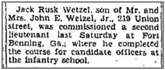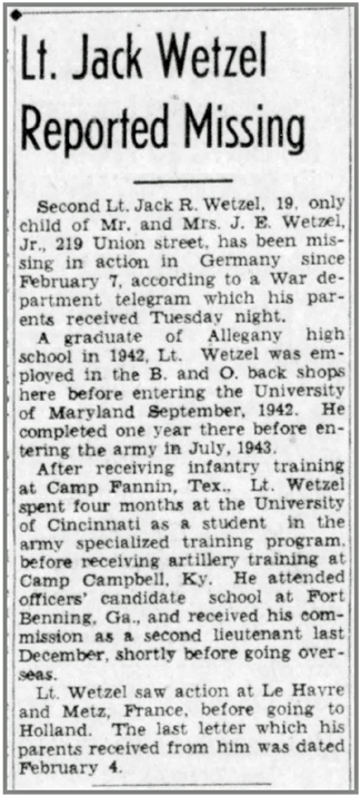 Jack Rusk Wetzel, son of John and Dorothea Wetzel, was born March 5, 1925 in Cumberland, Maryland. He registered for the draft March 5, 1943. At the time he was a student at the University of Maryland. He entered military service in July 1943, attended officers' candidate school at Fort Benning, Georgia and was commissioned as 2nd Lieutenant December 2, 1944 before leaving for the ETO. He joined Company C, 137th Infantry Regiment from the 53rd Replacement Battalion on January 22, 1945. 2nd Lt Jack R Wetzel was originally reported missing and it was later confirmed that he was killed in action February 7, 1945 in the vicinity of Aphoven, Germany west of the Roer River. He is buried at Netherlands American Cemetery, Margraten, Netherlands.
