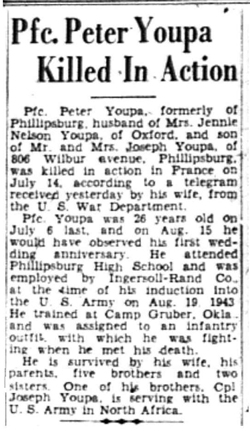 Peter Thomas Youpa, son of Joseph and Anna (Bakos Kupcha) Youpa, was born July 6, 1918 in Phillipsburg, New Jersey. He registered for the draft October 6, 1940 and was inducted into the Army July 29, 1943 at Newark, New Jersey. He joined Company E, 137th Infantry Regiment on July 13, 1944 from the 41st Replacement Battalion and served as a Rifleman. Pfc Peter T Youpa was killed in action the following day, July 14, 1944, in the vicinity of St Lo, France. He is buried at Saints Peter and Paul Byzantine Catholic Cemetery, Alpha, New Jersey.