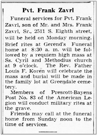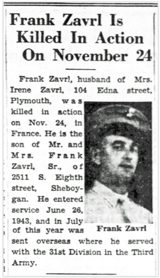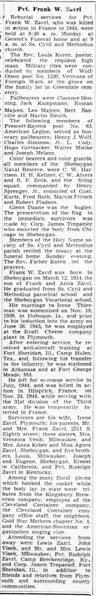 Frank William Zavrl, Jr, son of Frank William and Anna (Paskvalis) Zavrl, was born March 12, 1914 in Sheboygan, Wisconsin. He graduated from the Saints Cyril and Methodius parochial school and Sheboygan Vocational School. A Chicago and Northwestern Railroad employment record for Sheboygan shows him working as a Section Laborer as of July 8, 1937. He married Irene Thierman on November 18, 1938 in Dubuque, Iowa. The marriage record lists his place of residence as Drummond, Wisconsin and his occupation as farming. He registered for the draft October 16, 1940. At that time he was living in Plymouth, Wisconsin. He was employed by Kraft Cheese in Plymouth when he was inducted into the Army June 26, 1943. According to his obituary, after entering service, he received anti-aircraft training at Fort Sheridan, Illinois and Camp Hulen, Texas, and following his transfer to the Infantry, he was stationed in Arkansas and Fort Meade, Maryland.