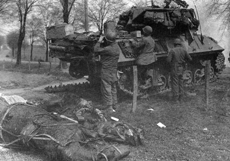 Crew of a knocked-out tank destroyer take cover behind their vehicle while trying to locate the gun that fired on them. In the foreground are some horses killed by the same gun.