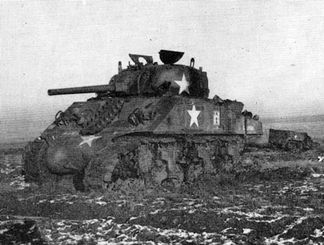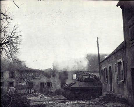 A new M-36 tank destroyer is ready for action in Germany. The burning building in the background was hit by a German shell earlier in the day
