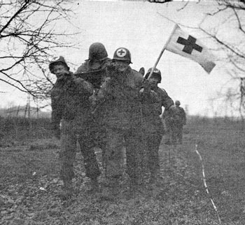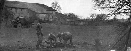 Medics of the 137th Infantry carry a casualty back through heavily mined fields in France